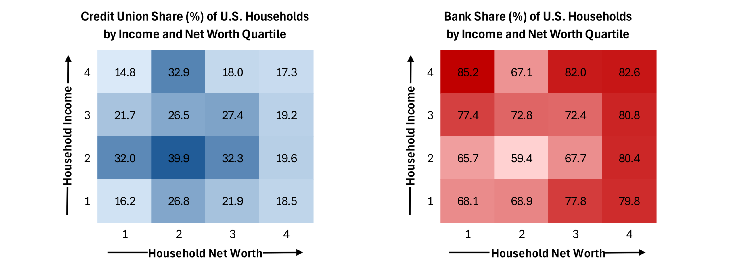 In order to consider both categories, ACU broke each into quartiles and created 4×4 matrices (Quartile 1 being the lowest, 4 the highest) and calculated credit unions’ market share in each of the 16 buckets. The results are striking:
